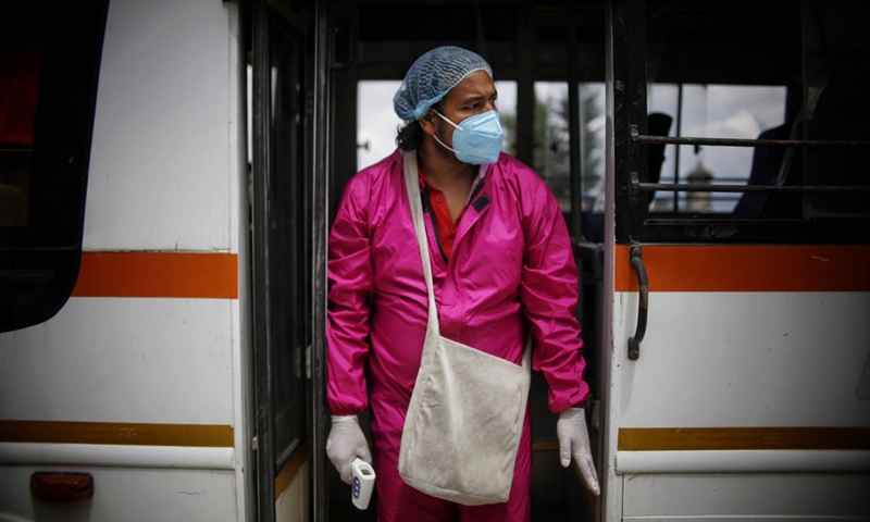 A staff member wearing a protective suit waits for passengers at a bus station in Kathmandu, Nepal, July 16, 2020. (Photo by Sulav Shrestha/Xinhua)
