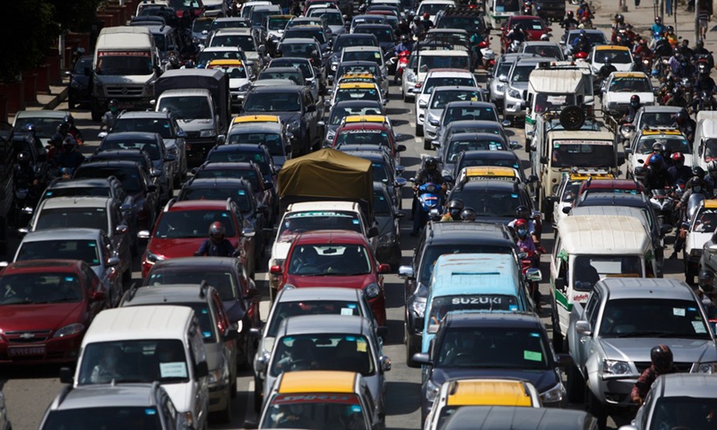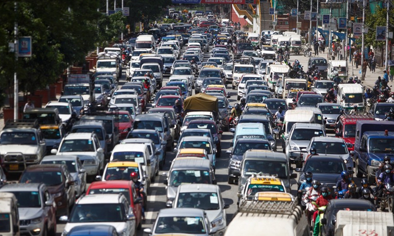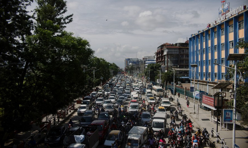 Long lines of vehicles wait at a police checkpoint causing a heavy traffic obstruction in Kathmandu, Nepal on Friday, July 17. (Xinhua/Sulav Shrestha)