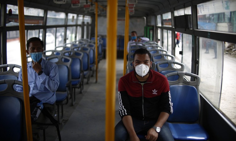People wearing masks take a bus in Kathmandu, Nepal, July 16, 2020. (Photo by Sulav Shrestha/Xinhua)