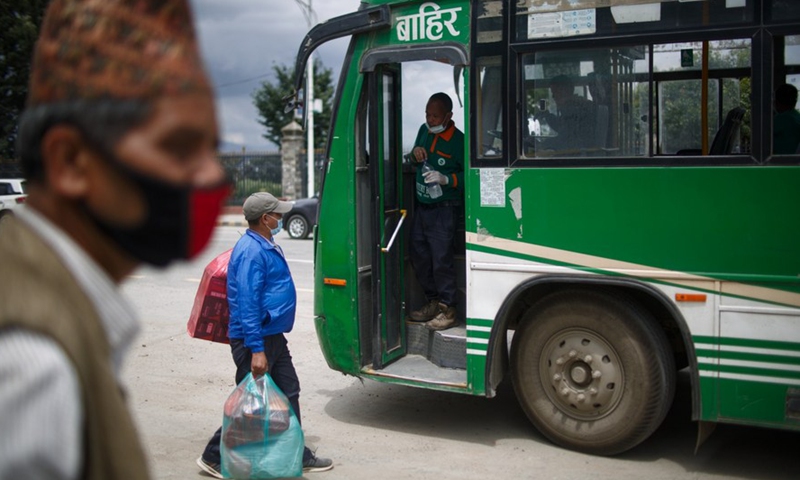 A passenger is to get on a bus in Kathmandu, Nepal, July 16, 2020. (Photo by Sulav Shrestha/Xinhua)