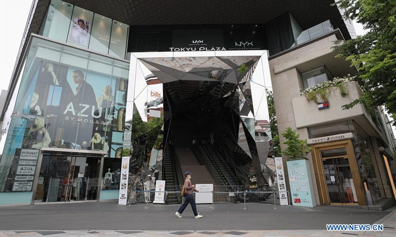 A shopping mall is temporarily closed in Tokyo's Harajuku District, Japan, on May 4, 2020. The Japanese government has recently proposed to help the tourism industry through the current difficulties by boosting domestic tourism which, seen as a source of economic growth, has been in trouble since the start of the year due to the COVID-19 outbreak. However, in the context of the recent resurgence of the pandemic in Japan, the promotion of tourism has sparked controversy. Experts have said the outbreak is likely to persist for a long time, and fighting the epidemic while promoting tourism recovery is bound to be difficult. The recovery of Japan's tourism industry may be a long process, they said. (Xinhua/Du Xiaoyi)