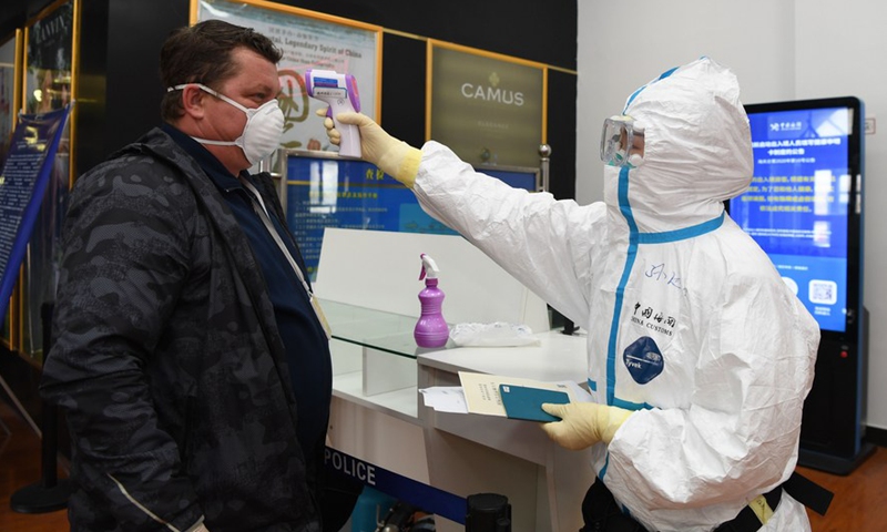 A staff member checks body temperature for a truck driver from Kazakhstan at an inspection hall in Alataw Pass, northwest China's Xinjiang Uygur Autonomous Region, April 11, 2020.Photo:Xinhua