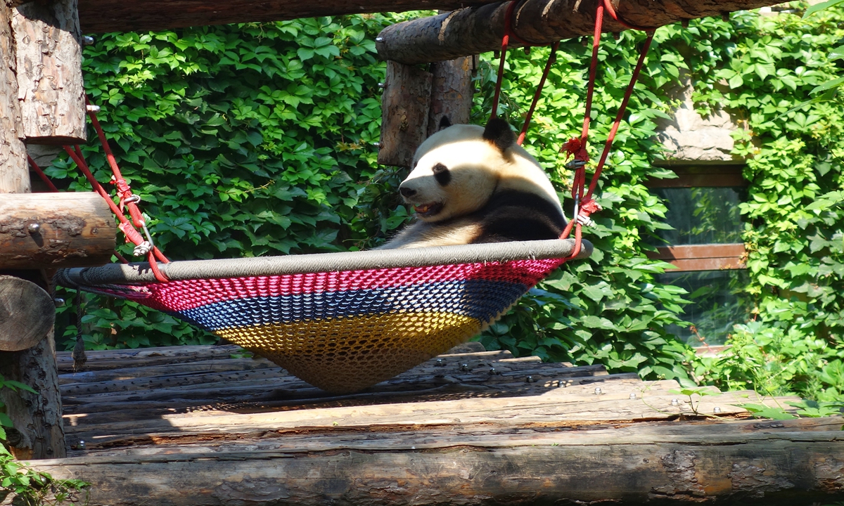 A giant panda cools itself in a cradle under a tree at a zoo in Beijing on a humid day. Photo: IC