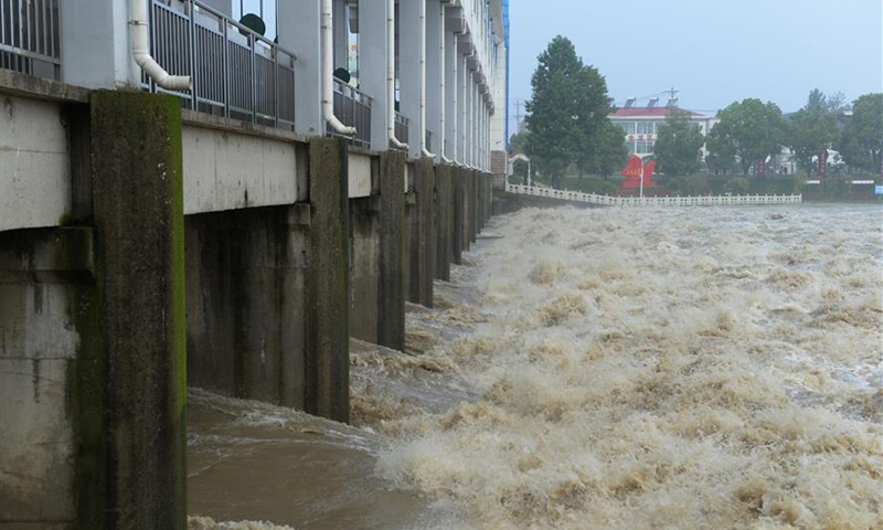 Floodwater from the Huaihe River are diverted through the Wangjiaba floodgate into the Mengwa Flood Detention Area in Funan County, east China's Anhui Province, July 20, 2020. The Mengwa Flood Detention Area in Anhui has been put into use at 0032 GMT Monday in the wake of rising water level in the Huaihe River. (Xinhua/Huang Bohan)