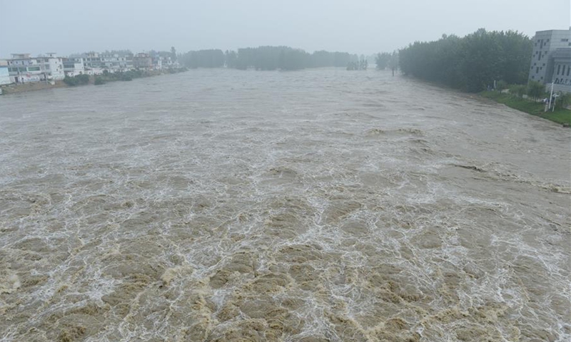 Floodwater from the Huaihe River are diverted into the Mengwa Flood Detention Area in Funan County, east China's Anhui Province, July 20, 2020. The Mengwa Flood Detention Area in Anhui has been put into use at 0032 GMT Monday in the wake of rising water level in the Huaihe River. (Xinhua/Huang Bohan)