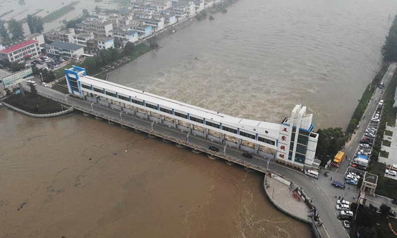 Aerial photo shows floodwater from the Huaihe River being diverted through the Wangjiaba floodgate into the Mengwa Flood Detention Area in Funan County, east China's Anhui Province, July 20, 2020. The Mengwa Flood Detention Area in Anhui has been put into use at 0032 GMT Monday in the wake of rising water level in the Huaihe River. (Xinhua/Huang Bohan)