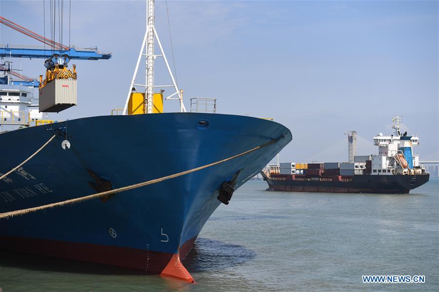 Aerial photo taken on July 15, 2020 shows freighters moored at a container port in Quanzhou, southeast China's Fujian Province. From January to June this year, Quanzhou City granted export tax rebates worth 7.053 billion yuan (about 1.009 billion U.S. dollars) to relieve the financial pressure on export enterprises amid COVID-19. (Xinhua/Song Weiwei)