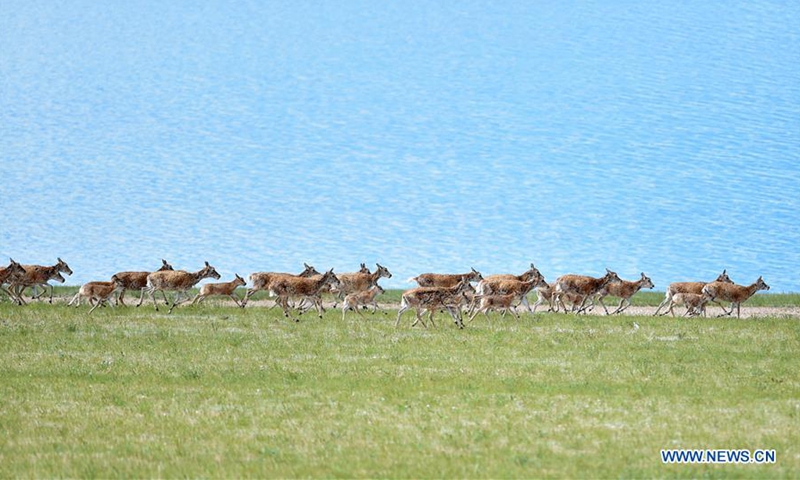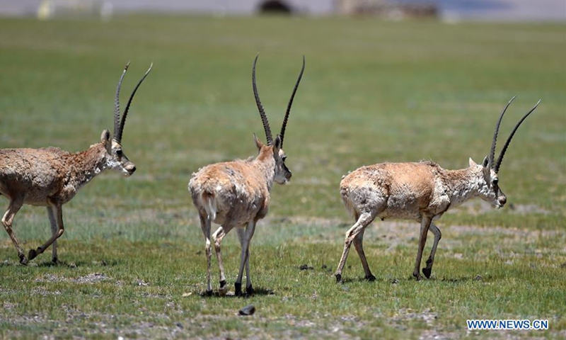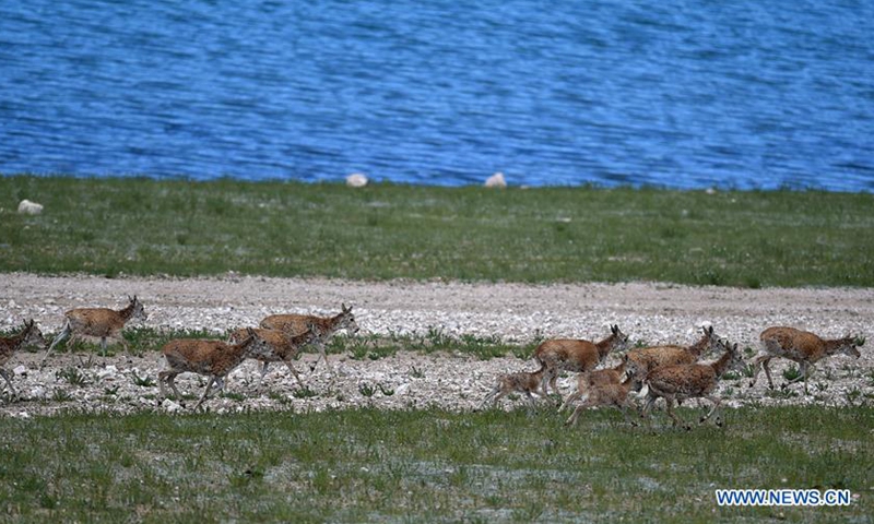 Photo taken on July 19, 2020 shows Tibetan antelopes near Co Ngoin Lake in southwest China's Tibet Autonomous Region. The population of wild animals in the state-level nature reserve has increased in recent years thanks to effective protection efforts. The Tibetan antelope population in the nature reserve has exceeded 150,000, of which nearly 60,000 are now seen near Rongmar Township located in the heart of the nature reserve. (Xinhua/Chogo)