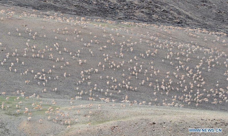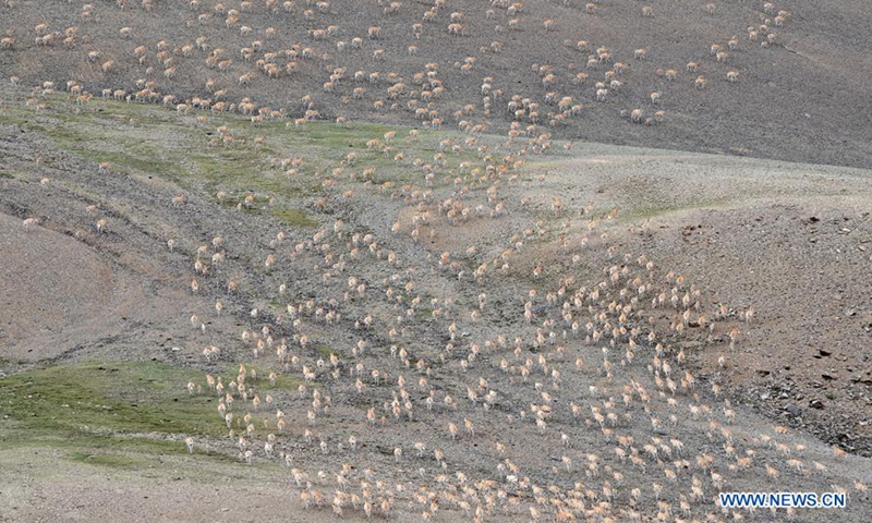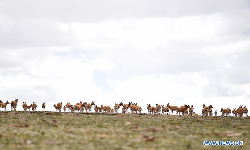 Photo taken on July 17, 2020 shows Tibetan antelopes grazing near Rongmar Township of Nyima County at the Qiangtang National Nature Reserve in southwest China's Tibet Autonomous Region. The population of wild animals in the state-level nature reserve has increased in recent years thanks to effective protection efforts. The Tibetan antelope population in the nature reserve has exceeded 150,000, of which nearly 60,000 are now seen near Rongmar Township located in the heart of the nature reserve. (Xinhua/Chogo)
