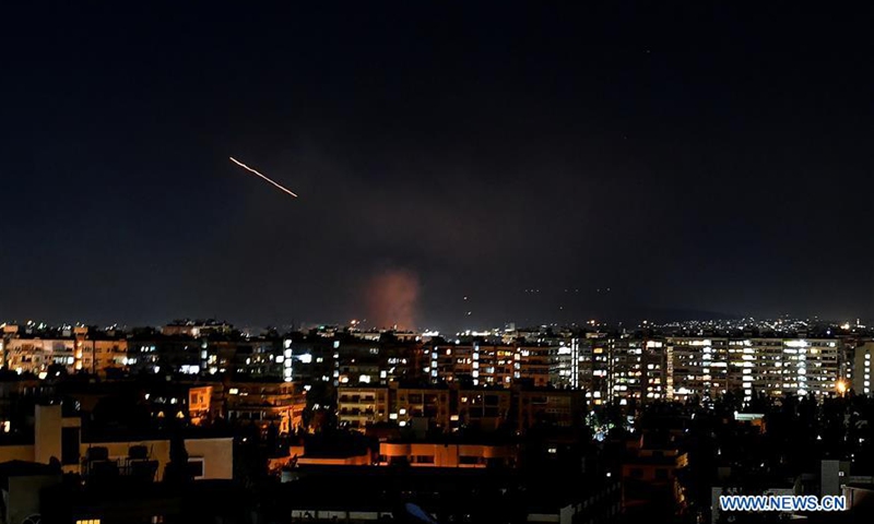 Syrian air defense missile is seen in the sky over Damascus, capital of Syria, on July 20, 2020. The Syrian air defenses responded to an Israeli missile attack over the capital Damascus on Monday evening, state news agency SANA reported. (Photo by Ammar Safarjalani/Xinhua)