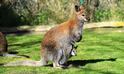 A kangaroo and its cub are on a meadow at Faunia outside Madrid, Spain, on April 19, 2018. Faunia is a nature theme park where visitors can get very close to animals. (Xinhua/Guo Qiuda)
