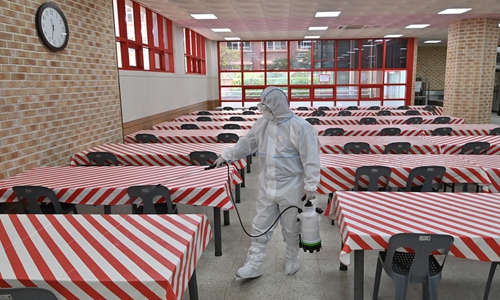 A health official wearing protective gear sprays disinfectant in a cafeteria at a high school in Seoul, South Korea. Photo: AFP