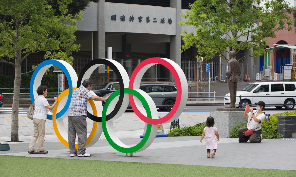 People pose next to the Olympic Rings in front of the Japan Olympic Museum in Shinjuku, Tokyo. Photo: VCG