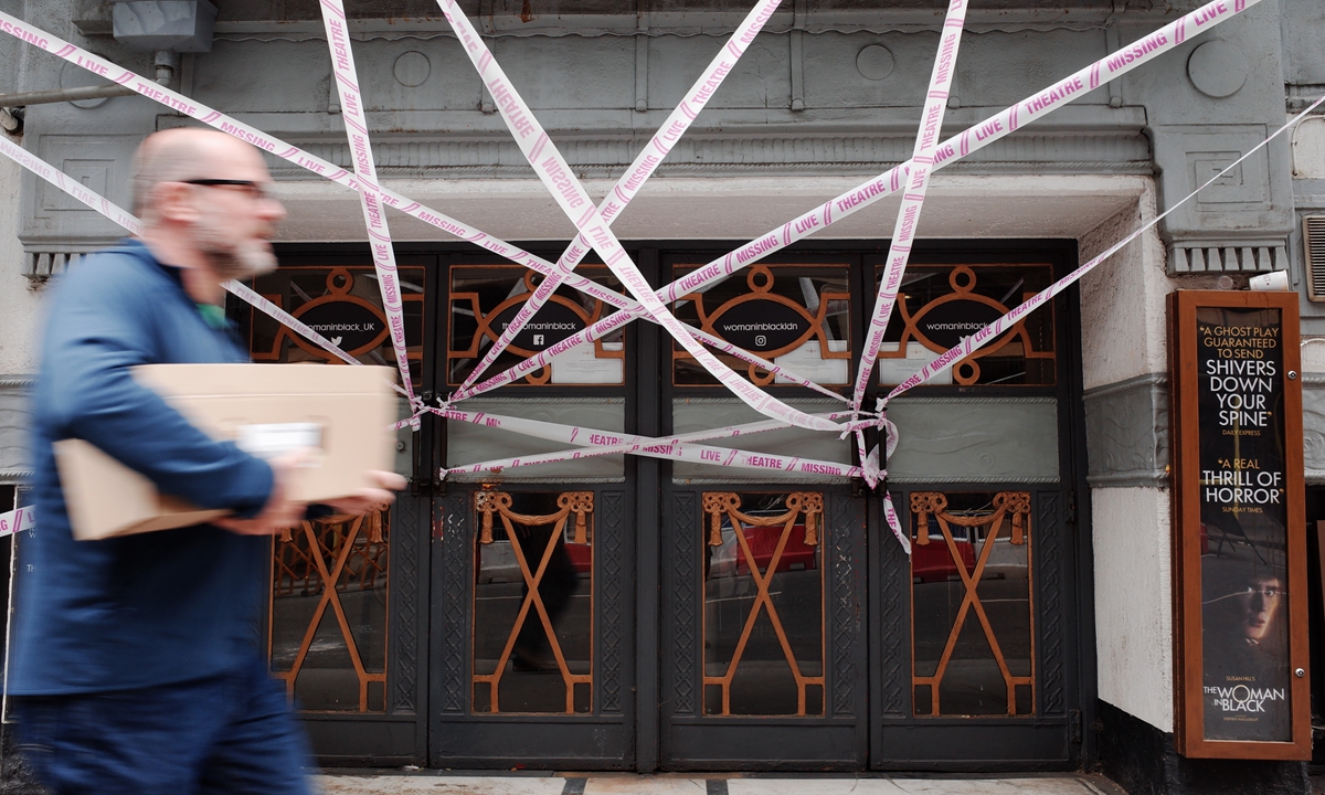 A man walks past tape bearing the message "Live Theatre Missing" stretched across the entrance to the closed Fortune Theatre in London on July 6. Photo: AFP