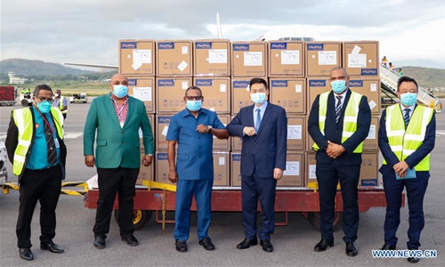 Chinese Ambassador to Papua New Guinea Xue Bing (3rd R) and Foreign Minister of Papua New Guinea Patrick Pruaitch (4th R) attend the donation ceremony in Port Moresby, Papua New Guinea, May 11. Photo: Xinhua