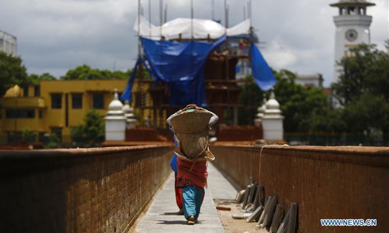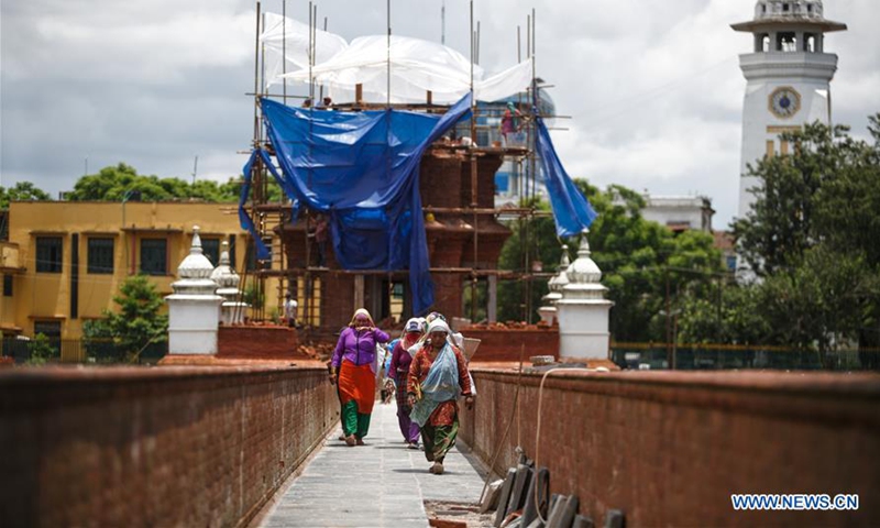 Nepalese women work at the reconstruction site of Rani Pokhari pond that was destroyed by earthquake in Kathmandu, Nepal on July 22, 2020. (Photo by Sulav Shrestha/Xinhua)