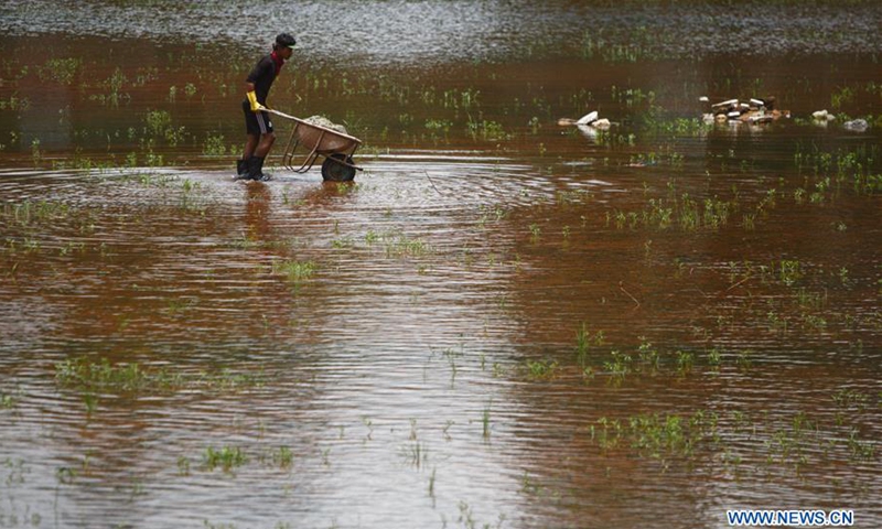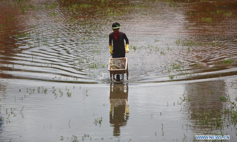A man works at the reconstruction site of Rani Pokhari pond that was destroyed by earthquake in Kathmandu, Nepal on July 22, 2020. (Photo by Sulav Shrestha/Xinhua)