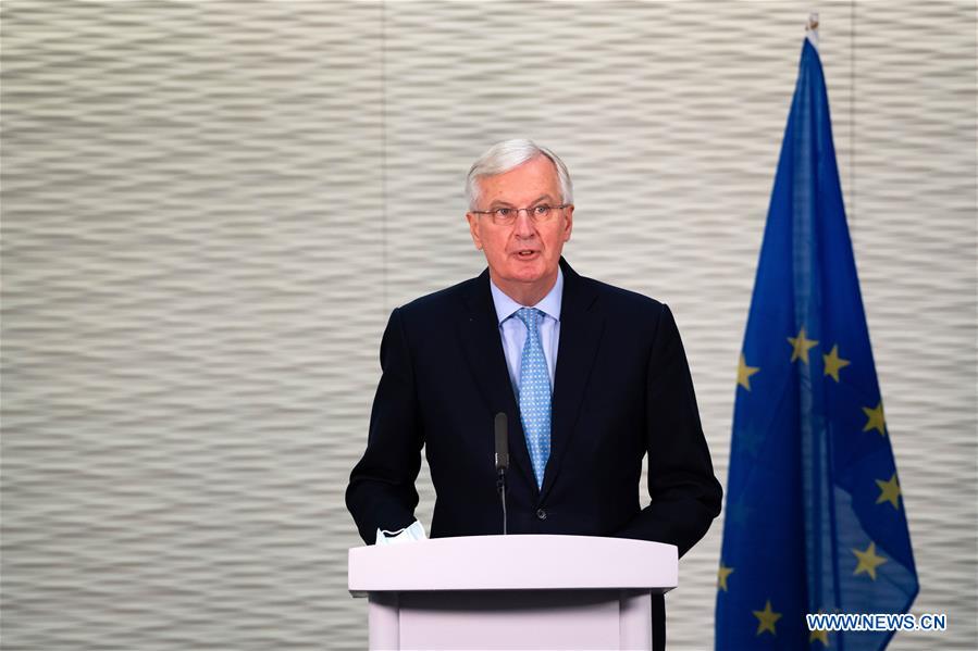 Michel Barnier, the European Union's (EU) chief negotiator for relations with the United Kingdom (UK), delivers a speech at a press conference in London, Britain, on July 23, 2020. Michel Barnier said Thursday that the UK's approach was making a post-Brexit trade deal "unlikely" as the sixth round of talks ended with little progress. (European Union/Handout via Xinhua)