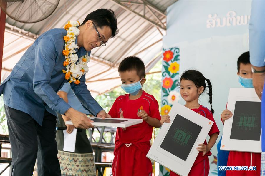 A child receives a smart board from a representative of the Chinese embassy in Laos during a handover ceremony in Vientiane, Laos, July 23, 2020. The Chinese embassy in Laos has donated 500 electronic smart boards to Lao kids in the affiliated kindergarten of the National University of Laos (NUOL) in capital Vientiane. (Photo by Kaikeo Saiyasane/Xinhua)