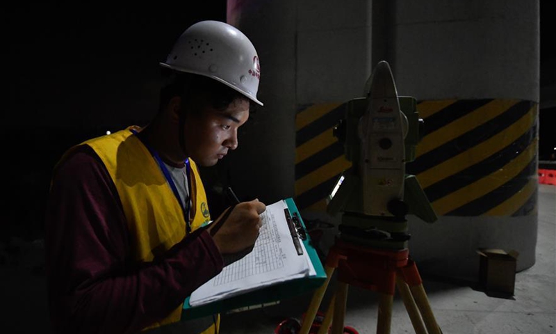 A constructor records data at the construction site of the Hangzhou-Shaoxing-Taizhou high-speed railway in east China's Zhejiang Province, July 23, 2020. The railway will start from the city of Hangzhou, crossing Shaoxing and ending in Taizhou, all cities in east China's Zhejiang Province. The railway is expected to be put into service at the end of 2021. (Xinhua/Huang Zongzhi)