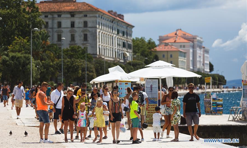 Tourists are seen by the seaside in Zadar, Croatia, July 25, 2020. Despite recent COVID-19 resurgence, Croatia recorded over 1.5 million tourists arrivals and more than 11 million over-night stays in the first 20 days in July, Croatian Tourism Association said on Wednesday. (Marko Dimic/Pixsell via Xinhua)