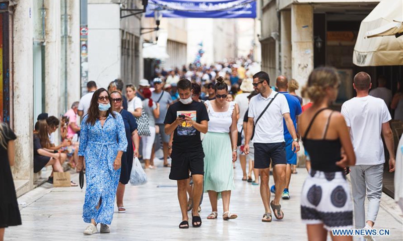 Tourists are seen on a street in Zadar, Croatia, July 25, 2020. Despite recent COVID-19 resurgence, Croatia recorded over 1.5 million tourists arrivals and more than 11 million over-night stays in the first 20 days in July, Croatian Tourism Association said on Wednesday. (Marko Dimic/Pixsell via Xinhua)