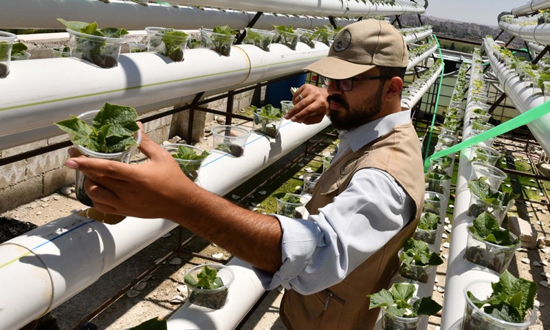 Abdul-Rahman al-Masri, a 23-year-old Syrian man, checks the vegetables he planted using the hydroponics system in the Beit Sahem area in the countryside of Damascus, Syria, on May 7, 2020. (Xinhua/Ammar Safarjalani)