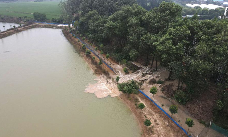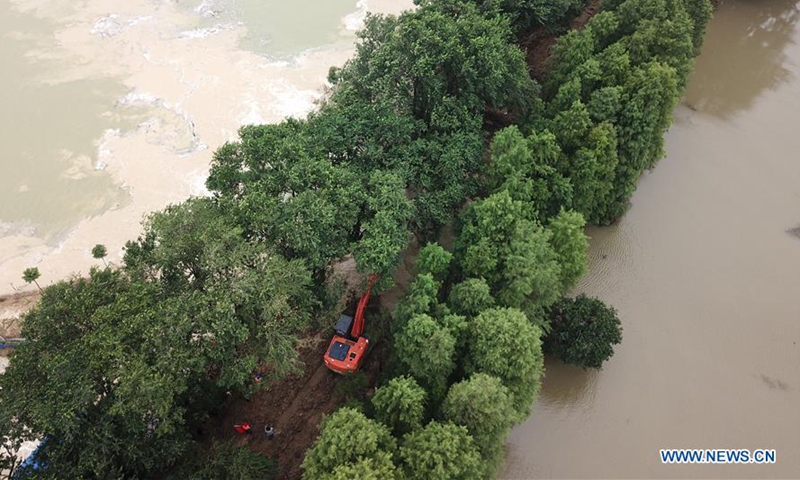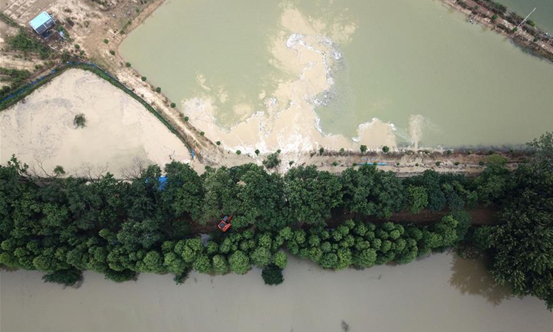 Aerial photo shows workers digging a channel between a flood storage area and the Jiangkou River in Feixi County of Hefei, east China's Anhui Province, July 26, 2020. A flood storage area near the Jiangkou River in Feixi County was put to use on Sunday, as the water level in the nearby Chaohu Lake remained high. Residents being affected due to the flood storage had already been evacuated. (Xinhua/Liu Junxi)