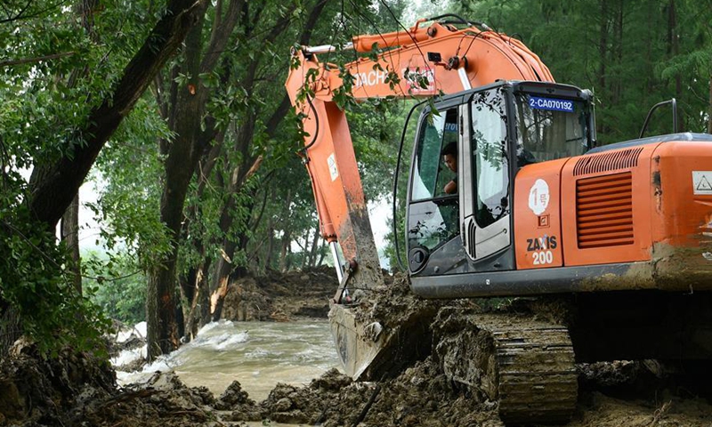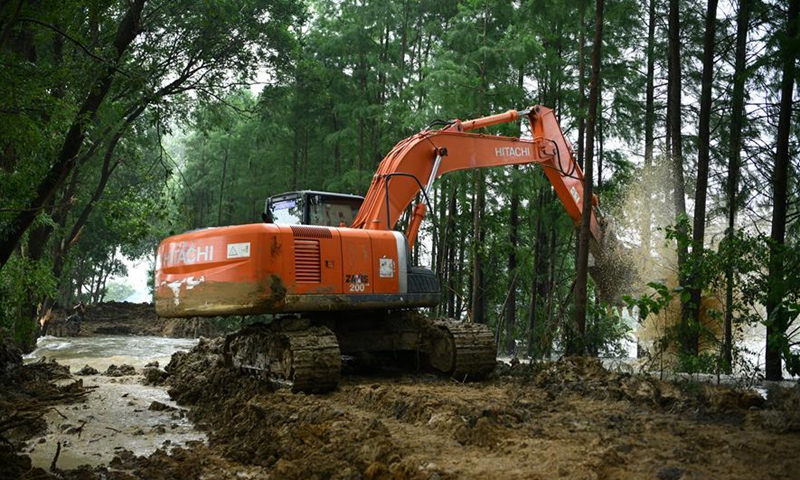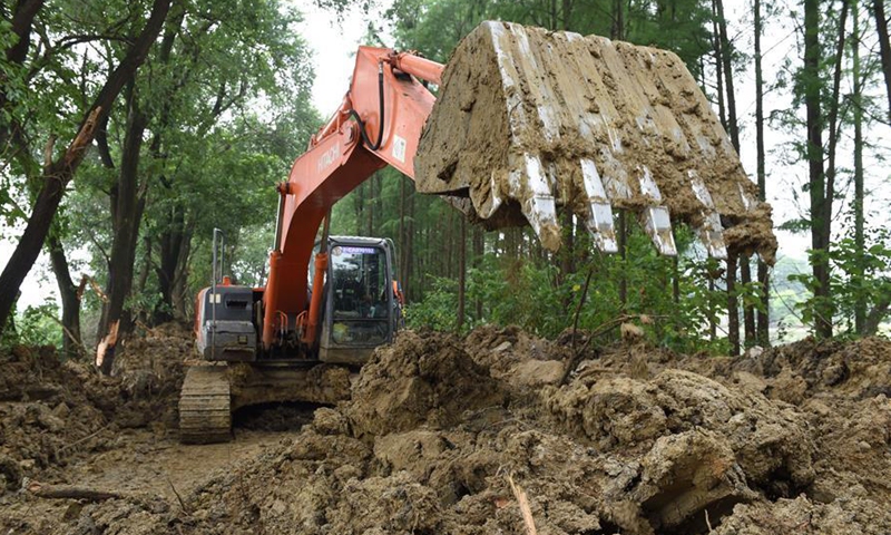 A worker operates an excavator to dig a channel between a flood storage area and the Jiangkou River in Feixi County of Hefei, east China's Anhui Province, July 26, 2020. A flood storage area near the Jiangkou River in Feixi County was put to use on Sunday, as the water level in the nearby Chaohu Lake remained high. Residents being affected due to the flood storage had already been evacuated. (Xinhua/Zhou Mu)
