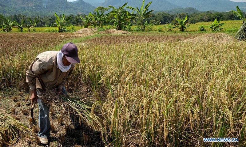 A man harvests rice at Tanjung Sari village, Bogor district of West Java province, Indonesia, July 26, 2020. (Xinhua/Veri Sanovri)
