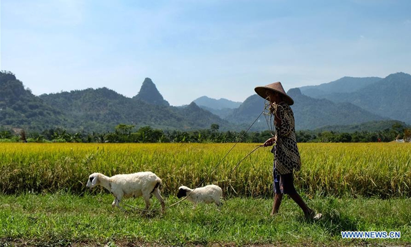 A goat herder walks past fields of rice at Tanjung Sari village, Bogor district of West Java province, Indonesia, July 26, 2020. (Xinhua/Veri Sanovri)