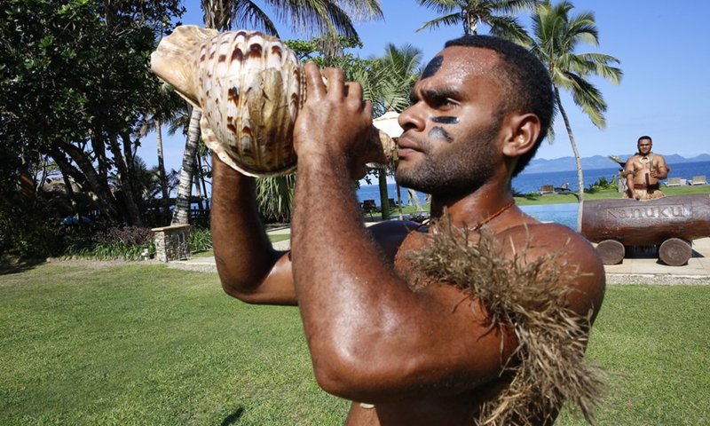 A traditional Fijian warrior blows a beautiful shell in Nanuku Auberge Resort on Fiji's main island of Viti Levu, July 21, 2020. (Xinhua/Zhang Yongxing)