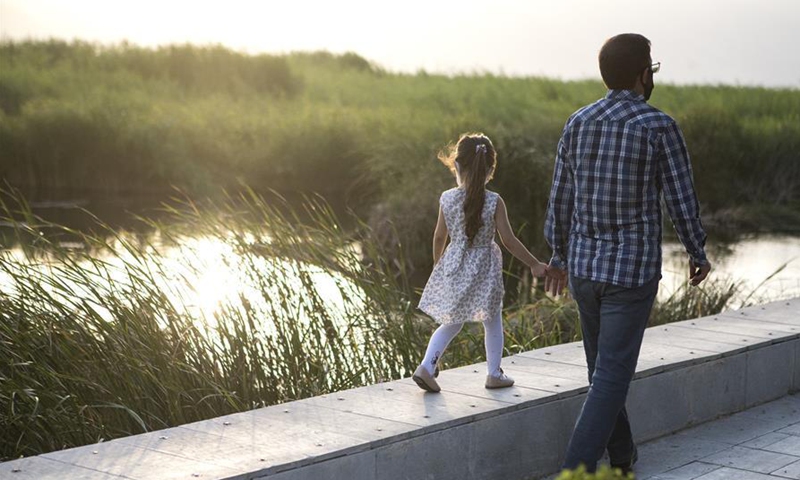 A man and his daughter walk by the Zarivar Lake in Marivan city, western Iran, July 25, 2020. (Photo by Ahmad Halabisaz/Xinhua)