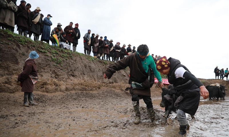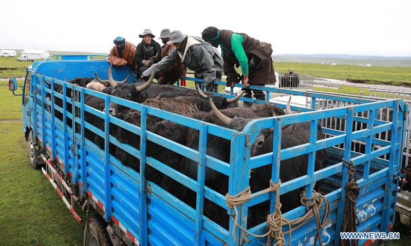 Local herdsmen lead their lost and found cattle back at the pasture Qianyangya in Koce Township of Gannan Tibetan Autonomous Prefecture, northwest China's Gansu Province, July 25, 2020. (Xinhua/Du Zheyu)