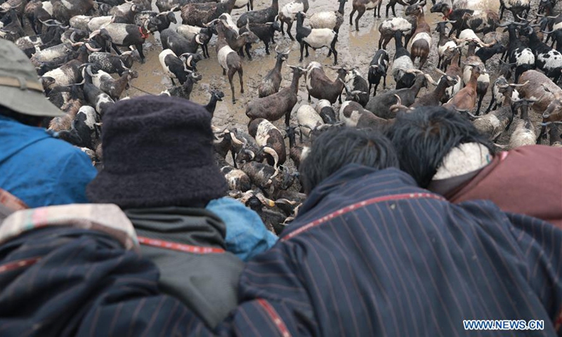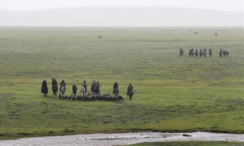 Local herdsmen lead a herd of sheep to the pasture Qianyangya in Koce Township of Gannan Tibetan Autonomous Prefecture, northwest China's Gansu Province, July 25, 2020. (Xinhua/Du Zheyu)