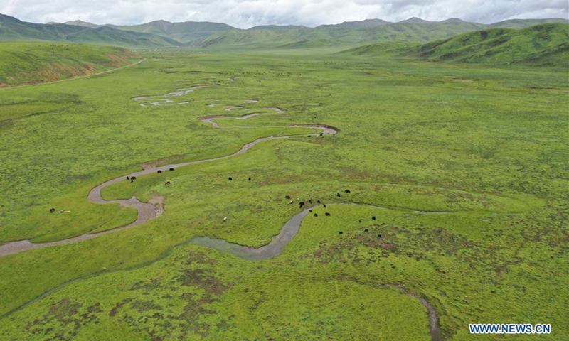 Aerial photo taken on July 25, 2020 shows the pasture Qianyangya in Koce Township of Gannan Tibetan Autonomous Prefecture, northwest China's Gansu Province. Since the 1980s, the pasture in Koce Township has been used as an area to reunite lost and found livestock with their owners. Once a year, local herdsmen gather here for one day to bring the livestock they have found while herding and look for their lost ones by identifying the body marks on cattle or sheep. The livestock can be brought home when their ownership is confirmed by most attendees. So far, over 20,000 lost and found livestock have returned to their owners. (Xinhua/Du Zheyu)