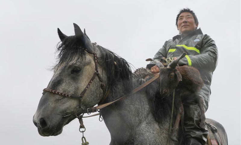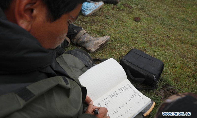 A representative of local herdsmen records the numbers of the livestock brought to the pasture Qianyangya in Koce Township of Gannan Tibetan Autonomous Prefecture, northwest China's Gansu Province, July 25, 2020. (Xinhua/Du Zheyu)