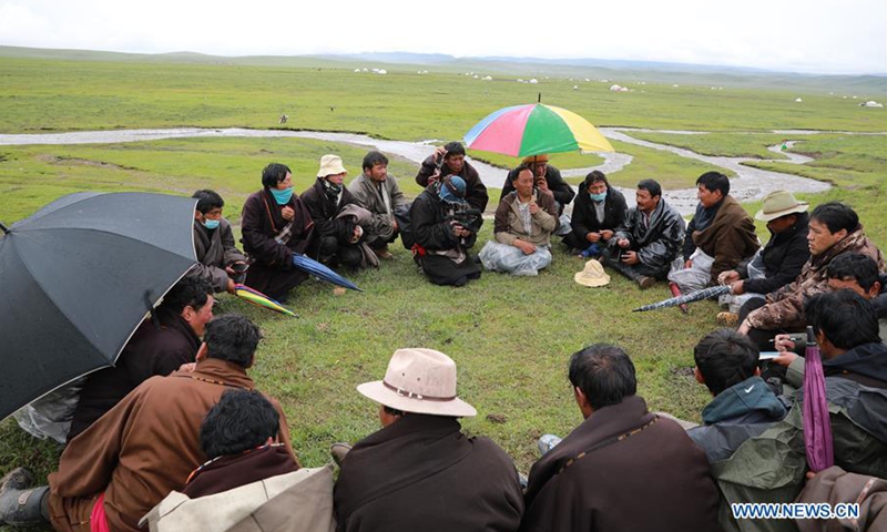 Local herdsmen draw lots to decide who should enter the pasture Qianyangya first in Koce Township of Gannan Tibetan Autonomous Prefecture, northwest China's Gansu Province, July 25, 2020. (Xinhua/Du Zheyu)