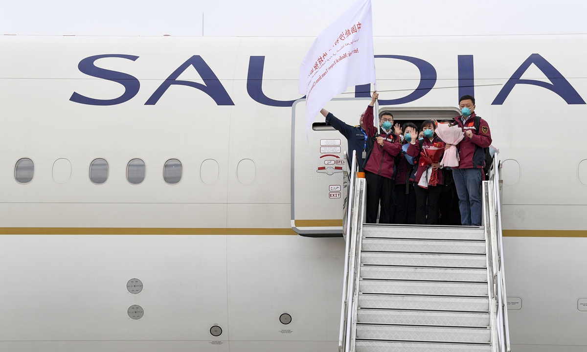 Members of a Chinese medical team board the plane to Saudi Arabia from Yinchuan, capital of Northwest China's Ningxia Hui Autonomous Region, on April 15 with medical supplies to assist in the fight against COVID-19. Photo: Xinhua