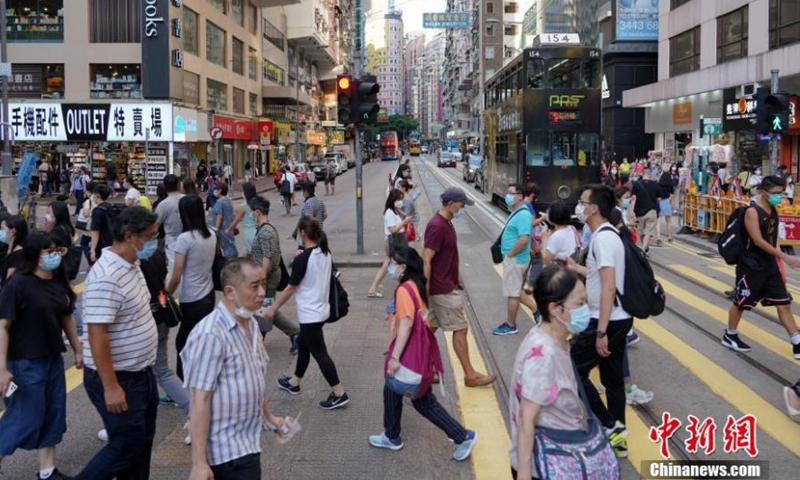 People wearing masks walk in the Central area of Hong Kong, south China, July 27, 2020. Hong Kong announced further tightening of anti-epidemic measures, including prohibition of dining-in services in restaurants and mandatory mask-wearing in all public places, which will come into effect on Wednesday.Photo:China News Service