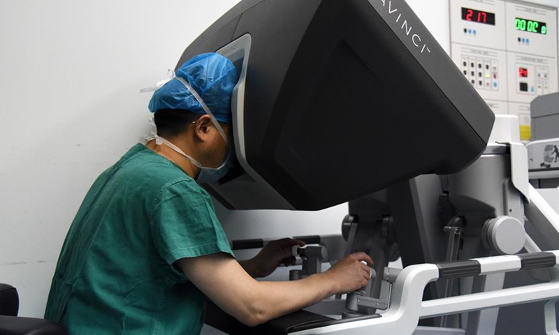 Tian Hui, vice president of Qilu Hospital of Shandong University and chief physician of thoracic surgery, manipulates the Da Vinci system during a surgery in Jinan, east China's Shandong Province, July 27, 2020. A Da Vinci surgical robotic system is put in use in the Qilu Hospital of Shandong University. The system is characterized by less trauma and more accurate treatment.Photo:Xinhua