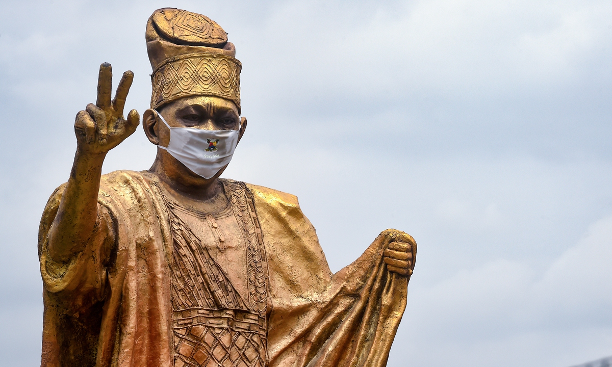 The statue of politician and late businessman Moshood Abiola wears a face mask at the MKO Abiola Garden, Alapere in Lagos, Nigeria on Monday. Photo: AFP