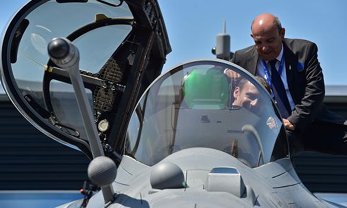 France's President Emmanuel Macron (C) sits in a Dassault Aviation Rafale fighter jet as Dassault Aviation's CEO Eric Trappier (R) looks on during the International Paris Air Show in Le Bourget, outside Paris, on June 19, 2017.Photo: Christophe Archambault/CFP