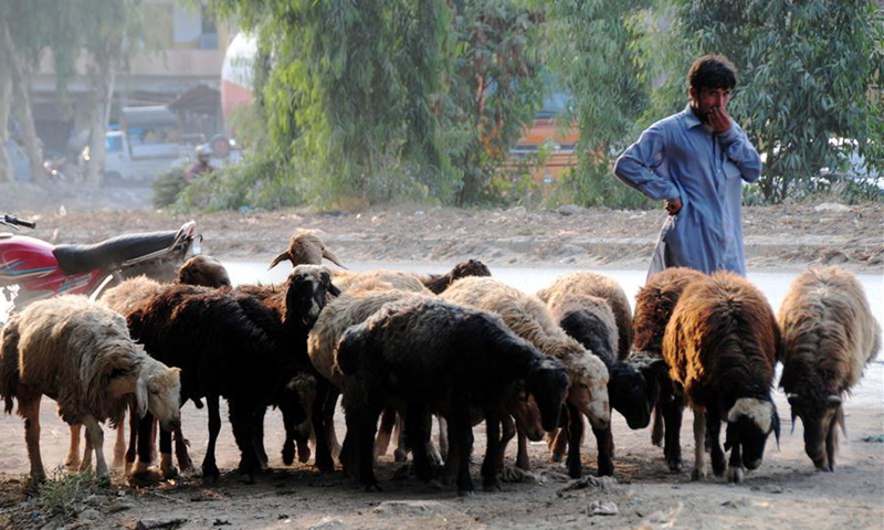 A trader waits for customers at a cattle market ahead of Eid al-Adha festival in northwest Pakistan's Peshawar on July 27, 2020. Muslims in Pakistan are preparing to celebrate Eid al-Adha, or the Festival of Sacrifice. (Photo by Saeed Ahmad/Xinhua)