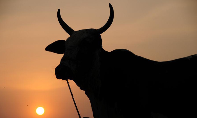 Photo taken on July 27, 2020 shows the silhouette of a bull against sunset at a cattle market ahead of Eid al-Adha festival in northwest Pakistan's Peshawar. Muslims in Pakistan are preparing to celebrate Eid al-Adha, or the Festival of Sacrifice. (Photo by Saeed Ahmad/Xinhua)
