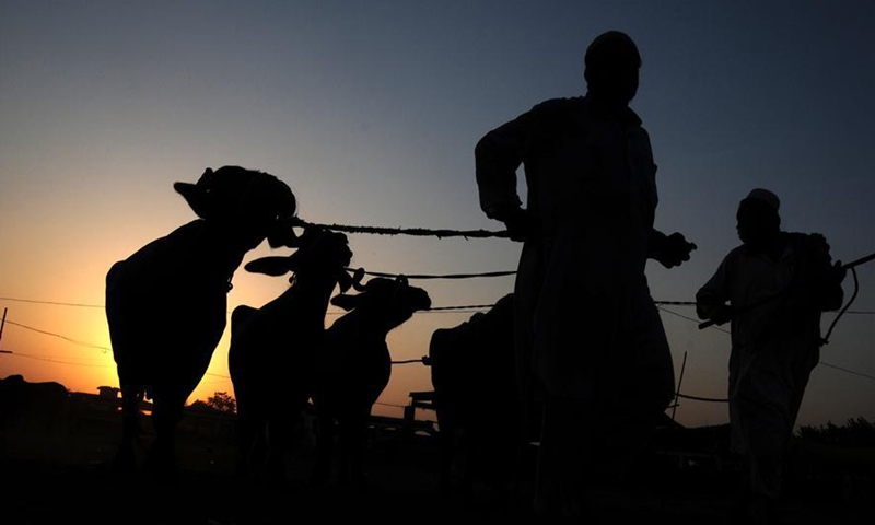 Photo taken on July 27, 2020 shows the silhouette of people visiting a cattle market against sunset ahead of Eid al-Adha festival in northwest Pakistan's Peshawar. Muslims in Pakistan are preparing to celebrate Eid al-Adha, or the Festival of Sacrifice. (Photo by Saeed Ahmad/Xinhua)