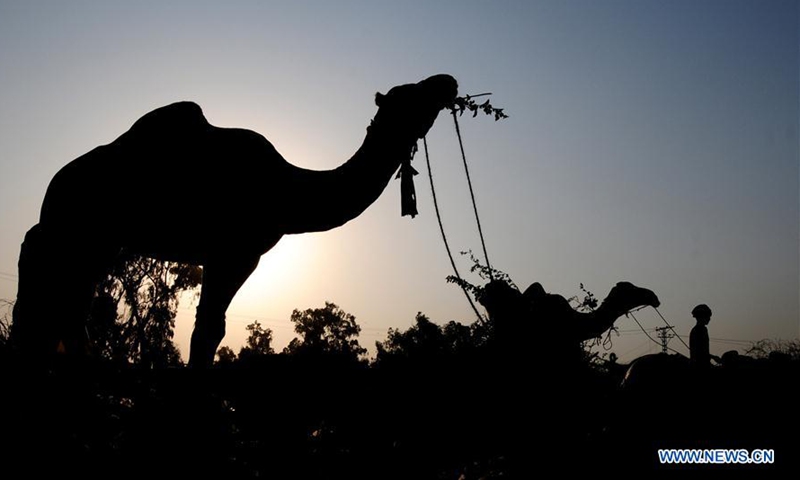 Photo taken on July 27, 2020 shows the silhouette of camels against sunset at a cattle market ahead of Eid al-Adha festival in northwest Pakistan's Peshawar. Muslims in Pakistan are preparing to celebrate Eid al-Adha, or the Festival of Sacrifice. (Photo by Saeed Ahmad/Xinhua)
