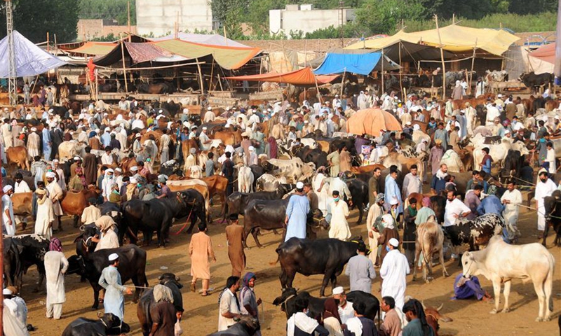 People visit a cattle market ahead of Eid al-Adha festival in northwest Pakistan's Peshawar on July 27, 2020. Muslims in Pakistan are preparing to celebrate Eid al-Adha, or the Festival of Sacrifice. (Photo by Saeed Ahmad/Xinhua)