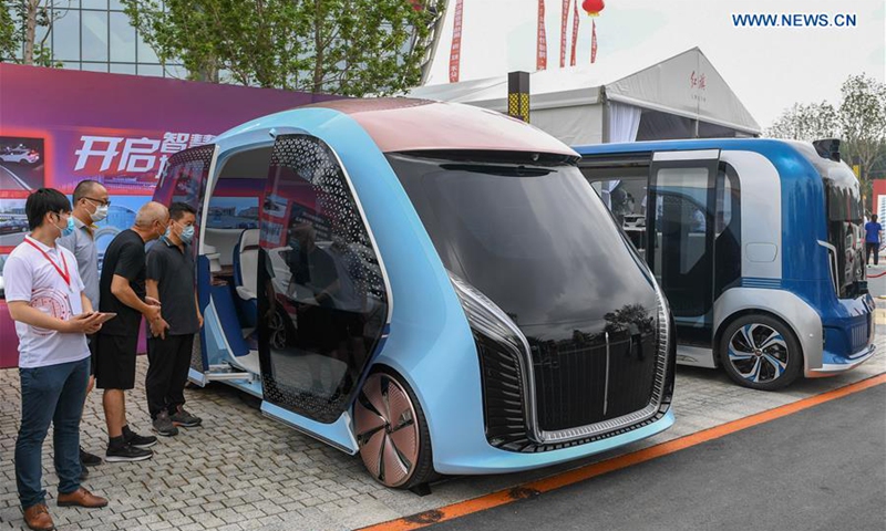 Visitors view concept vehicles during an event showcasing the products and culture of China's iconic auto brand Hongqi in Changchun, northeast China's Jilin Province, July 28, 2020. (Xinhua/Zhang Nan)