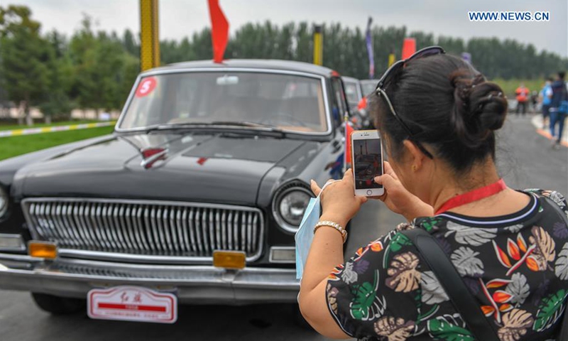 A visitor takes pictures of a limousine during an event showcasing the products and culture of China's iconic auto brand Hongqi in Changchun, northeast China's Jilin Province, July 28, 2020. (Xinhua/Zhang Nan)
